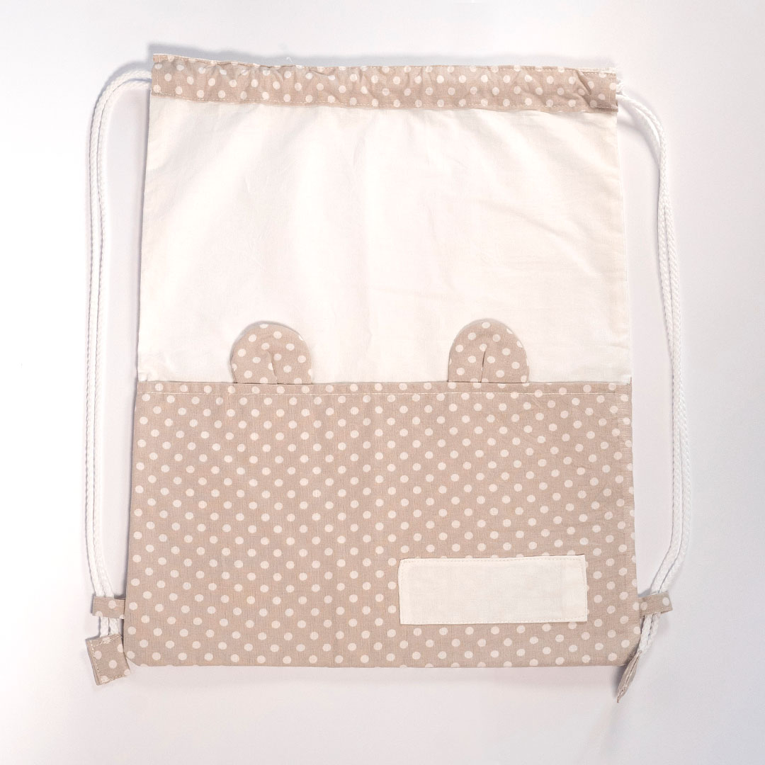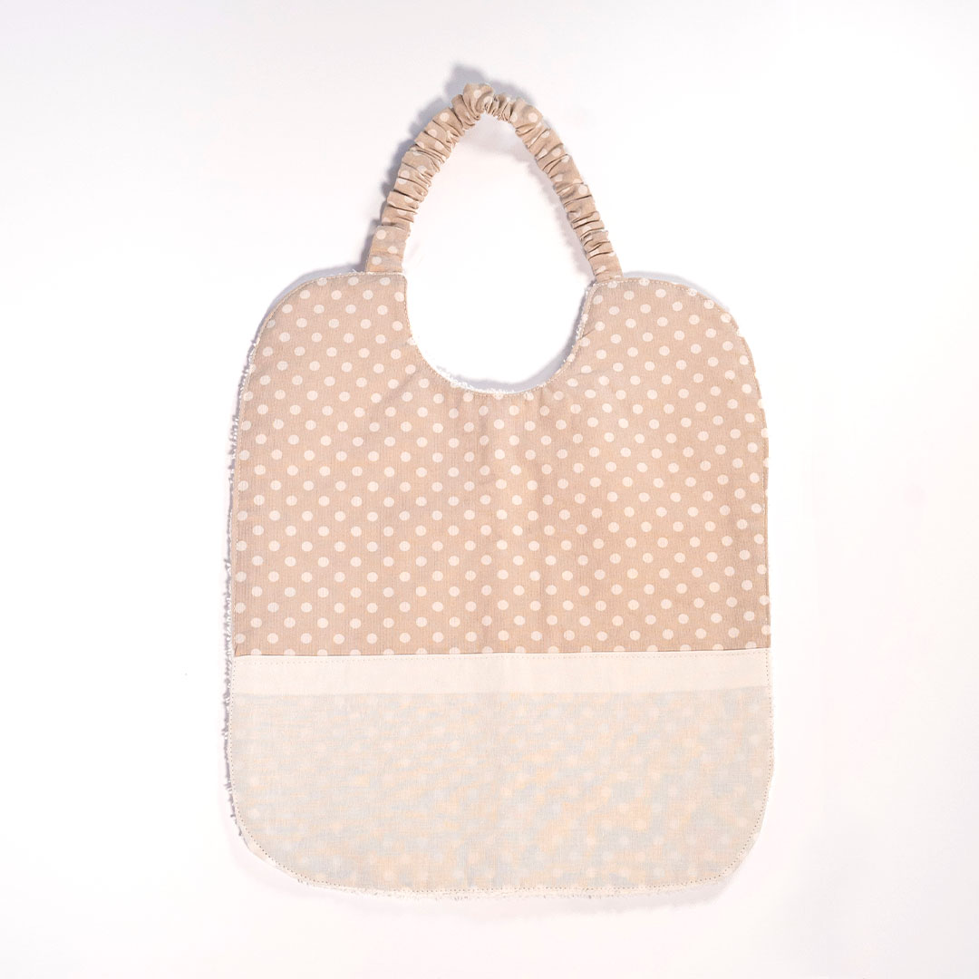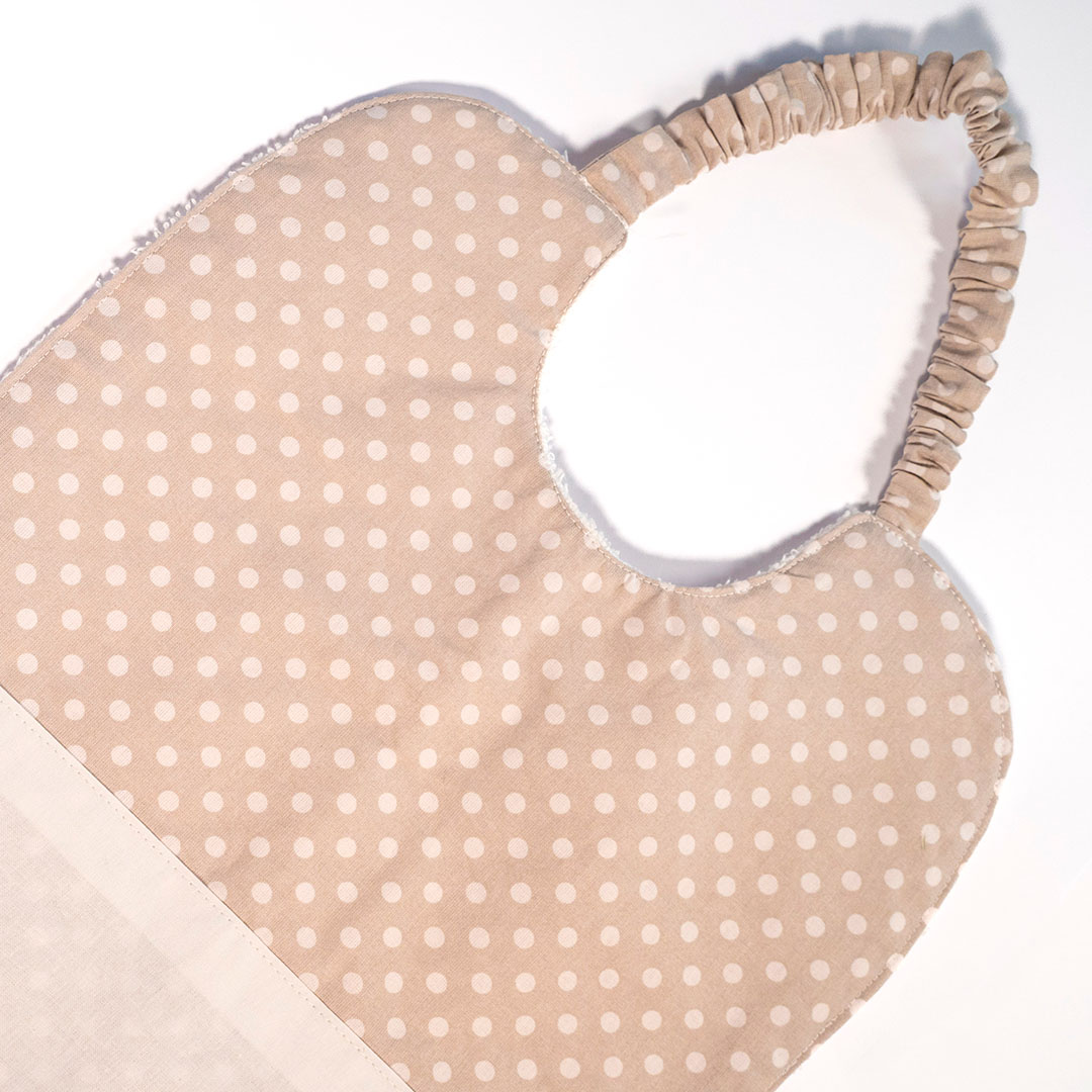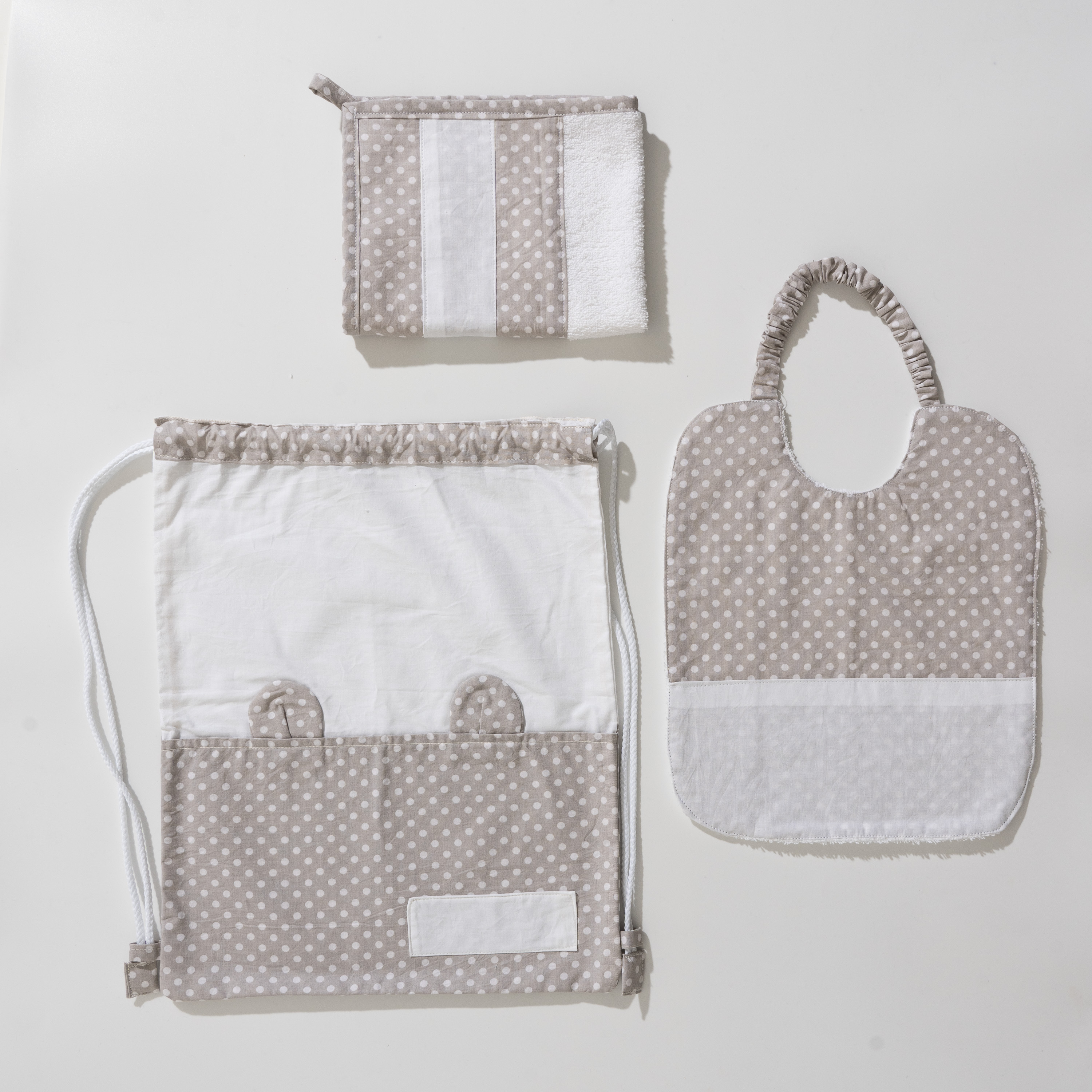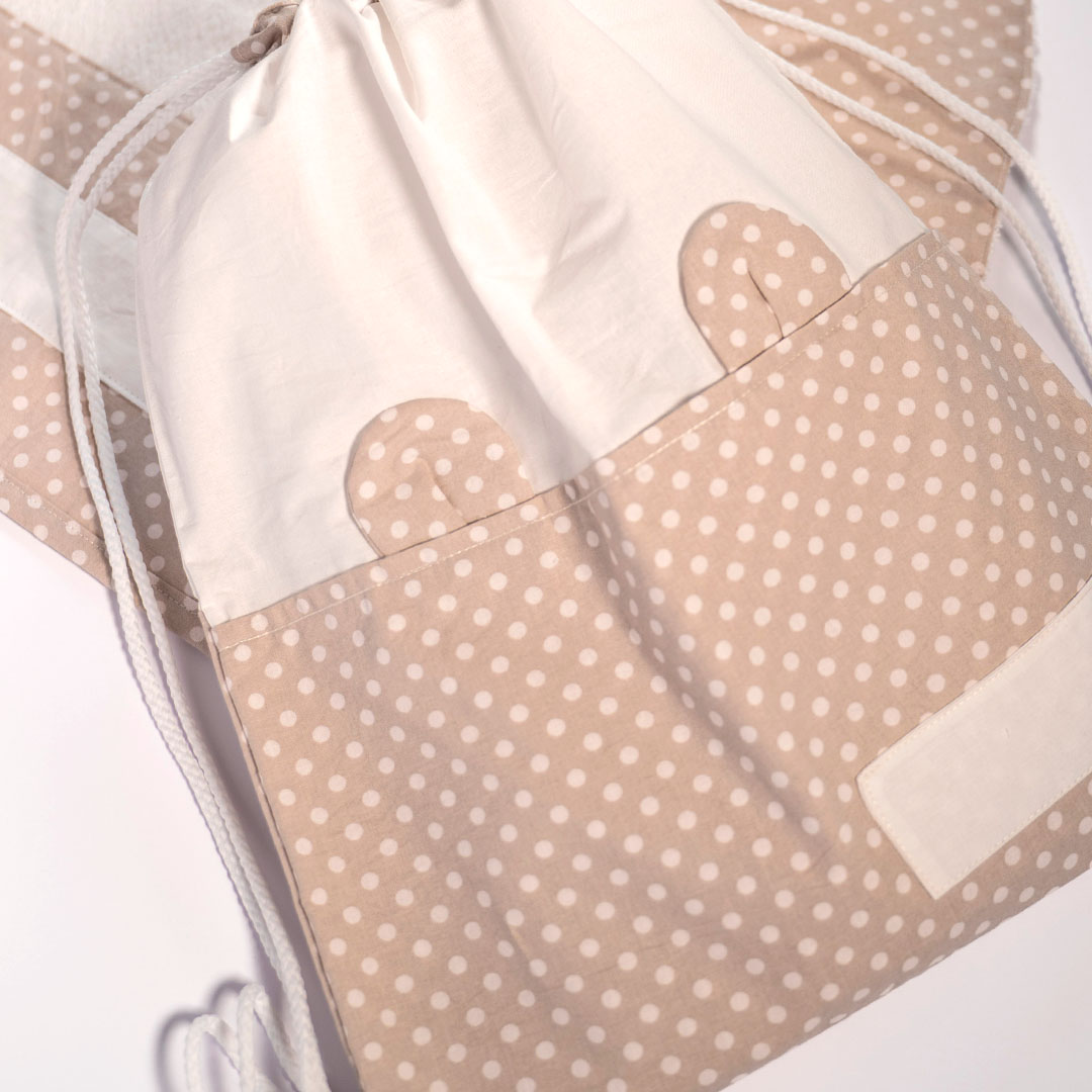 Preparati per l'asilo con stile con il set beige a pois. Composto da bavaglio con elastico, sacca con coulisse e asciugamano con asola, 100% cotone lavabile e personalizzabile con stampe in vinile, per un inizio scolastico all'insegna della dolcezza. Realizzato artigianalmente con materiali di recupero, rappresenta un impegno per la sostenibilità e la funzionalità. Ideale per chi desidera un accessorio funzionale che unisca stile e praticità, è progettato per durare nel tempo e per accompagnare i piccoli nelle loro avventure quotidiane. Tutto il set può essere personalizzato con il nome della bambina o del bambino: per personalizzazioni contattarci all'indirizzo redesign@coopsocialefai.it