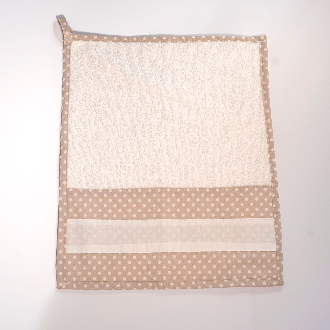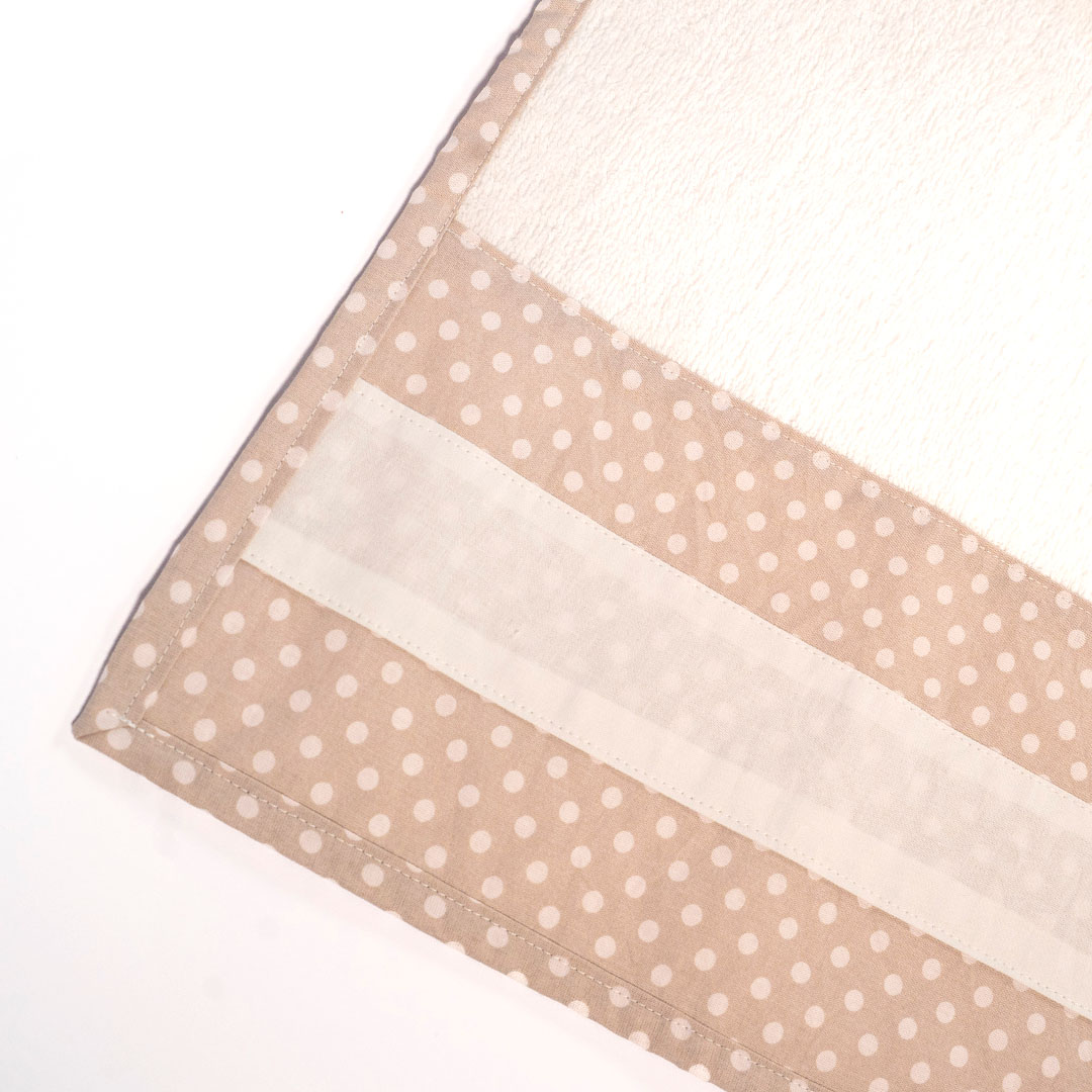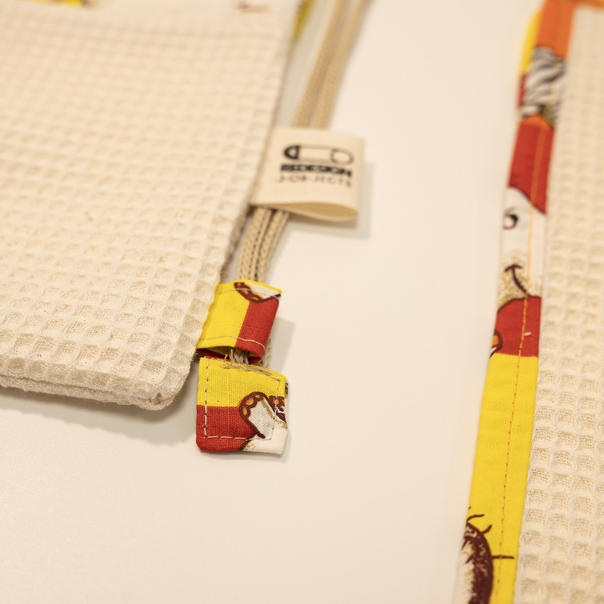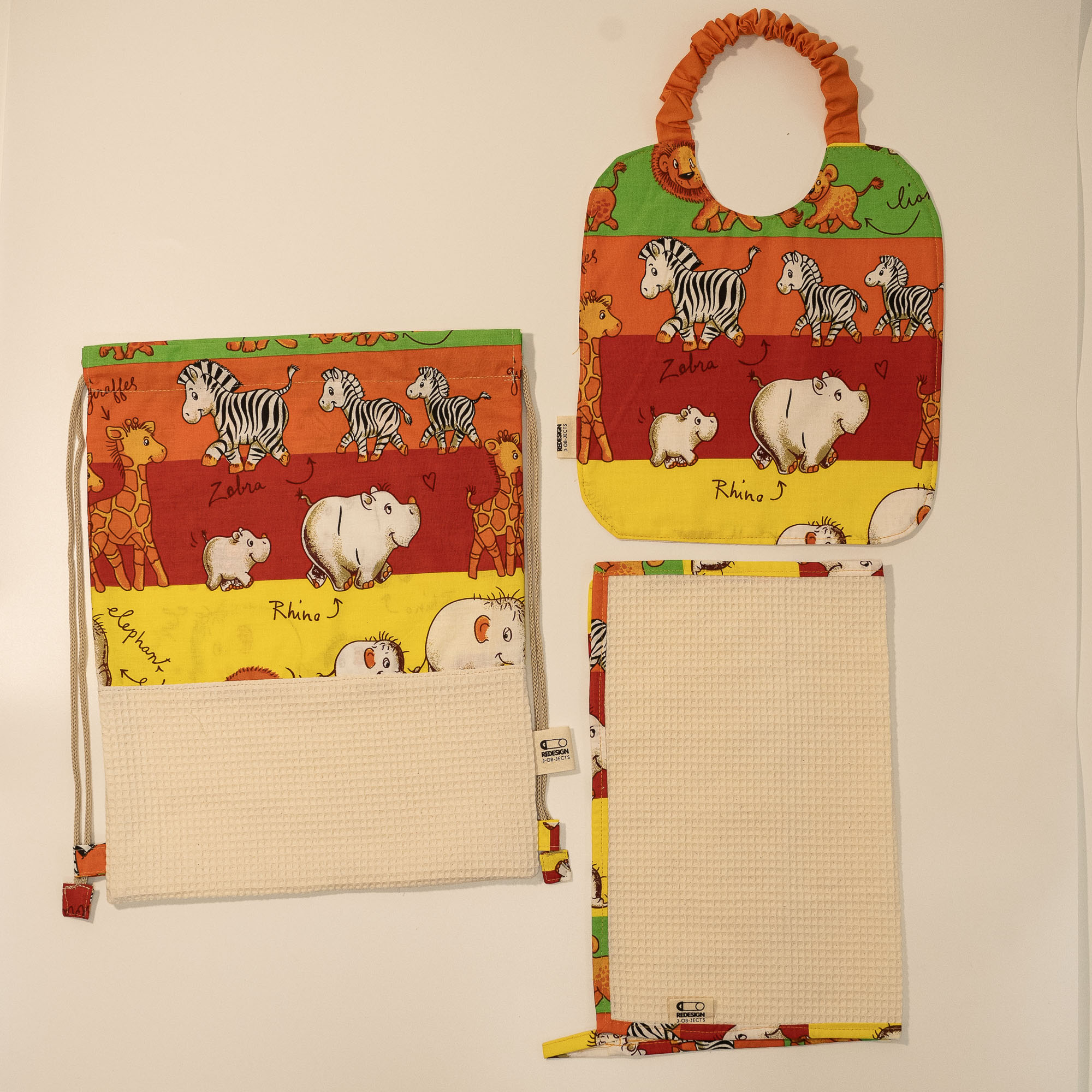 Preparati per l'asilo con stile con il set beige a pois. Composto da bavaglio con elastico, sacca con coulisse e asciugamano con asola, 100% cotone lavabile e personalizzabile con stampe in vinile, per un inizio scolastico all'insegna della dolcezza. Realizzato artigianalmente con materiali di recupero, rappresenta un impegno per la sostenibilità e la funzionalità. Ideale per chi desidera un accessorio funzionale che unisca stile e praticità, è progettato per durare nel tempo e per accompagnare i piccoli nelle loro avventure quotidiane. Tutto il set può essere personalizzato con il nome della bambina o del bambino: per personalizzazioni contattarci all'indirizzo redesign@coopsocialefai.it