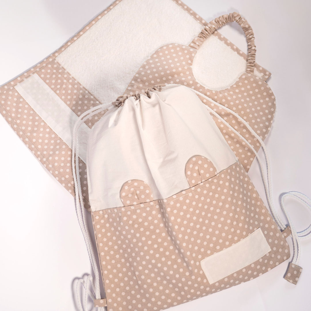 Preparati per l'asilo con stile con il set beige a pois. Composto da bavaglio con elastico, sacca con coulisse e asciugamano con asola, 100% cotone lavabile e personalizzabile con stampe in vinile, per un inizio scolastico all'insegna della dolcezza. Realizzato artigianalmente con materiali di recupero, rappresenta un impegno per la sostenibilità e la funzionalità. Ideale per chi desidera un accessorio funzionale che unisca stile e praticità, è progettato per durare nel tempo e per accompagnare i piccoli nelle loro avventure quotidiane. Tutto il set può essere personalizzato con il nome della bambina o del bambino: per personalizzazioni contattarci all'indirizzo redesign@coopsocialefai.it