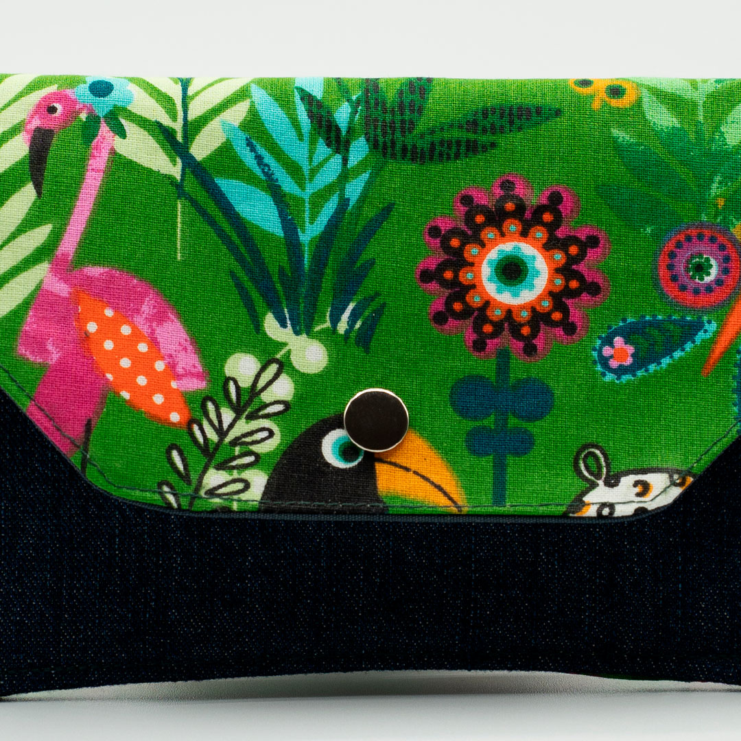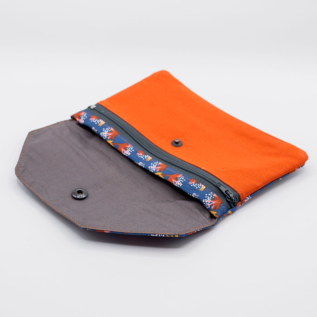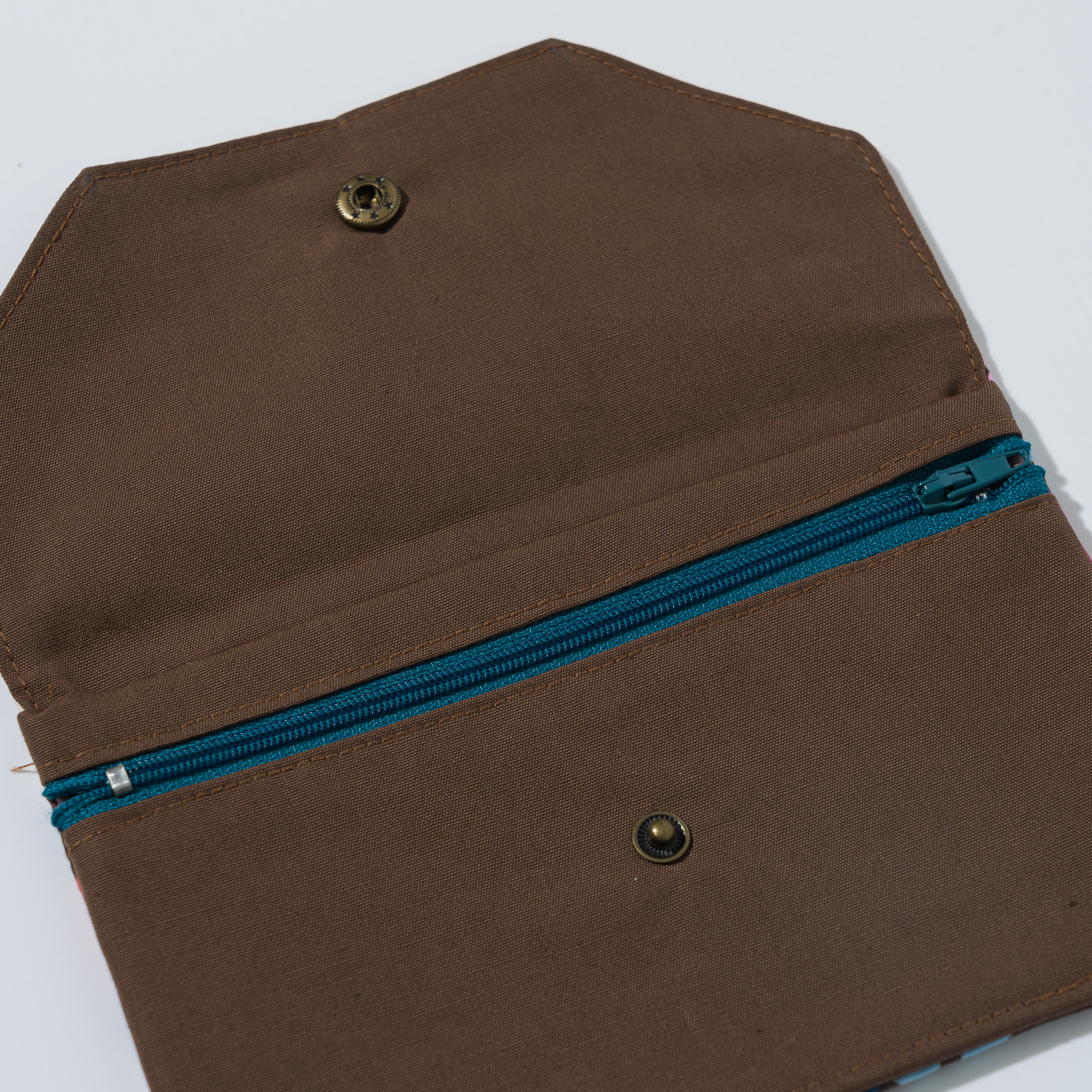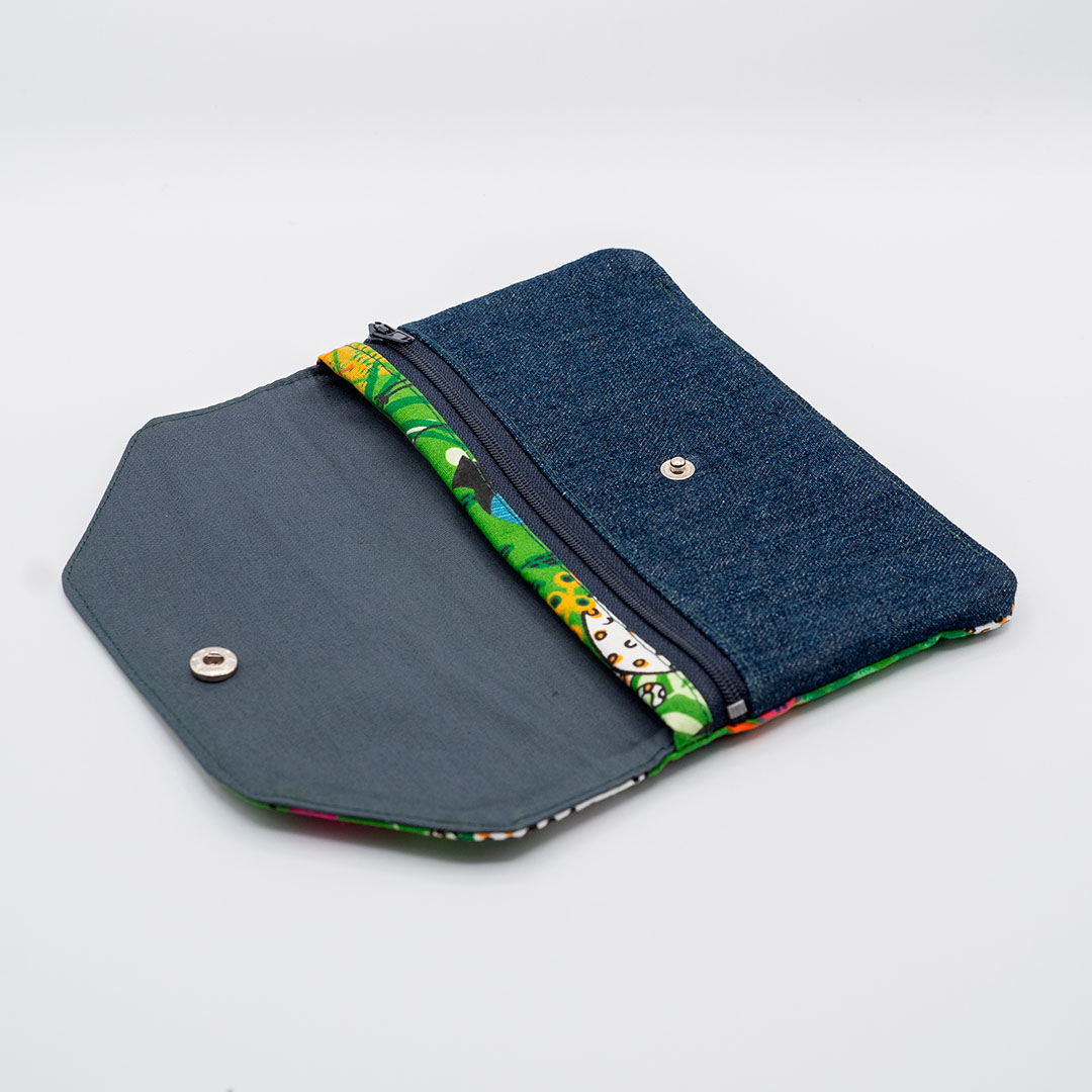 Portafoglio in tessuto taglia media, lavabile e pratico, con tasca con zip, portatessere e bottone in acciaio. Realizzato artigianalmente.