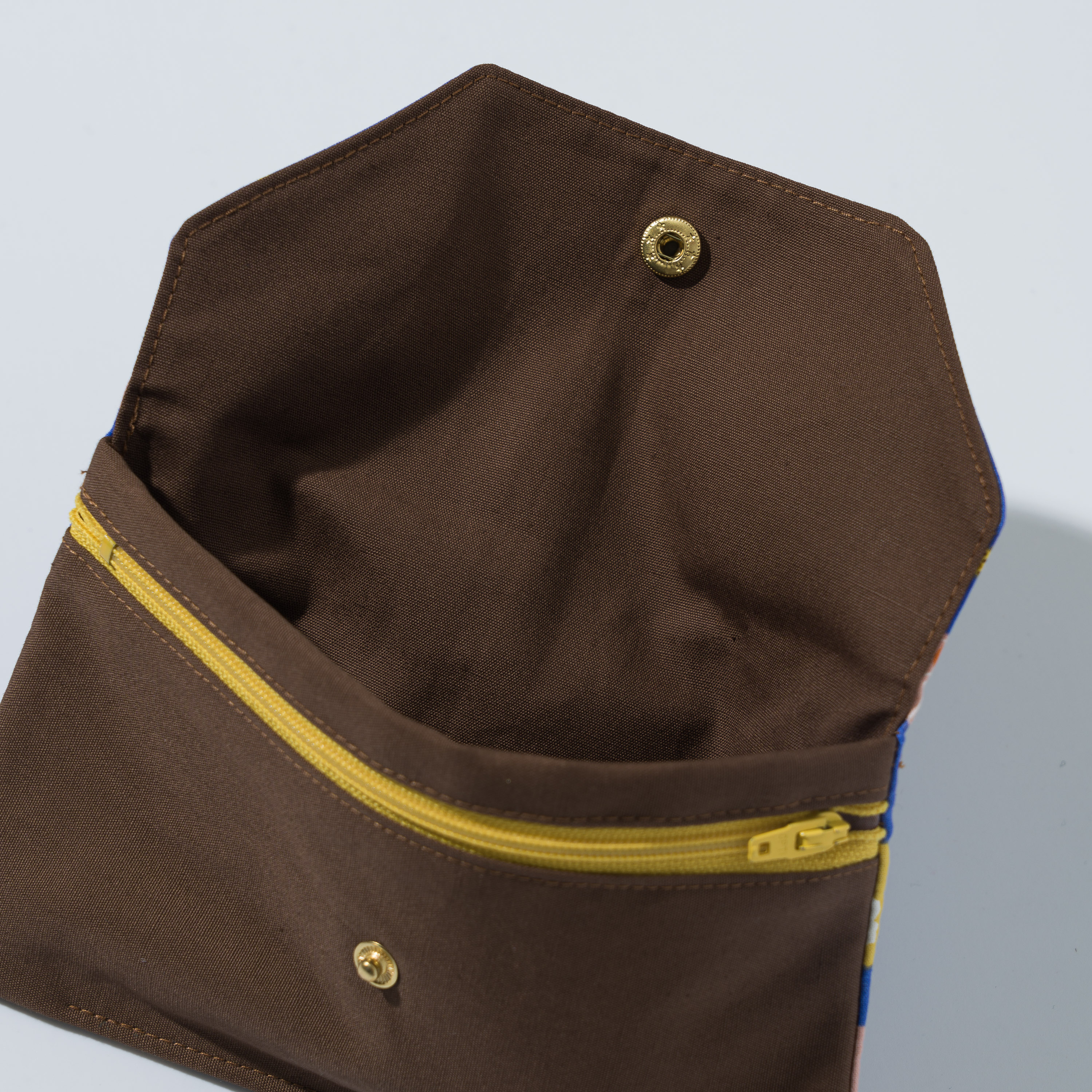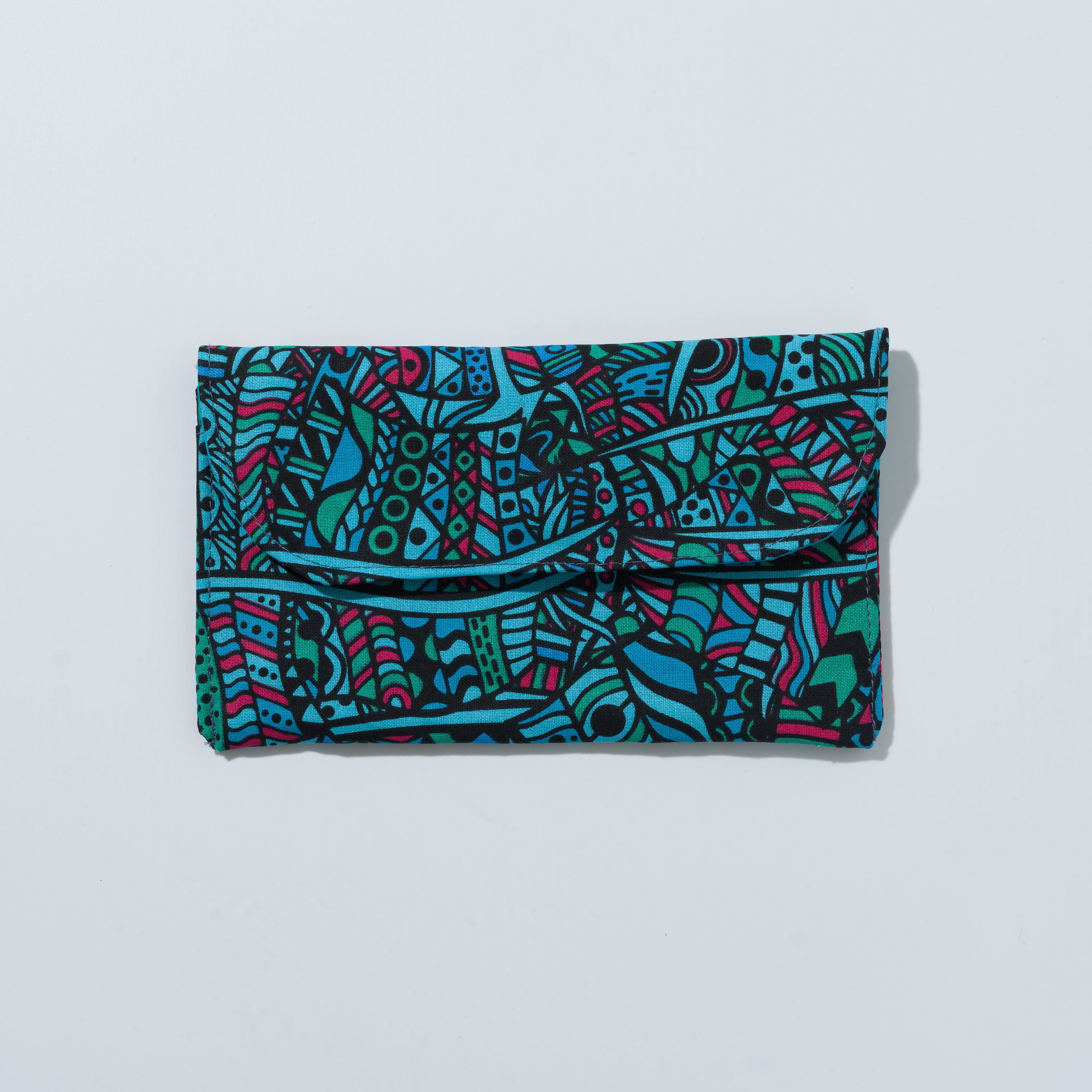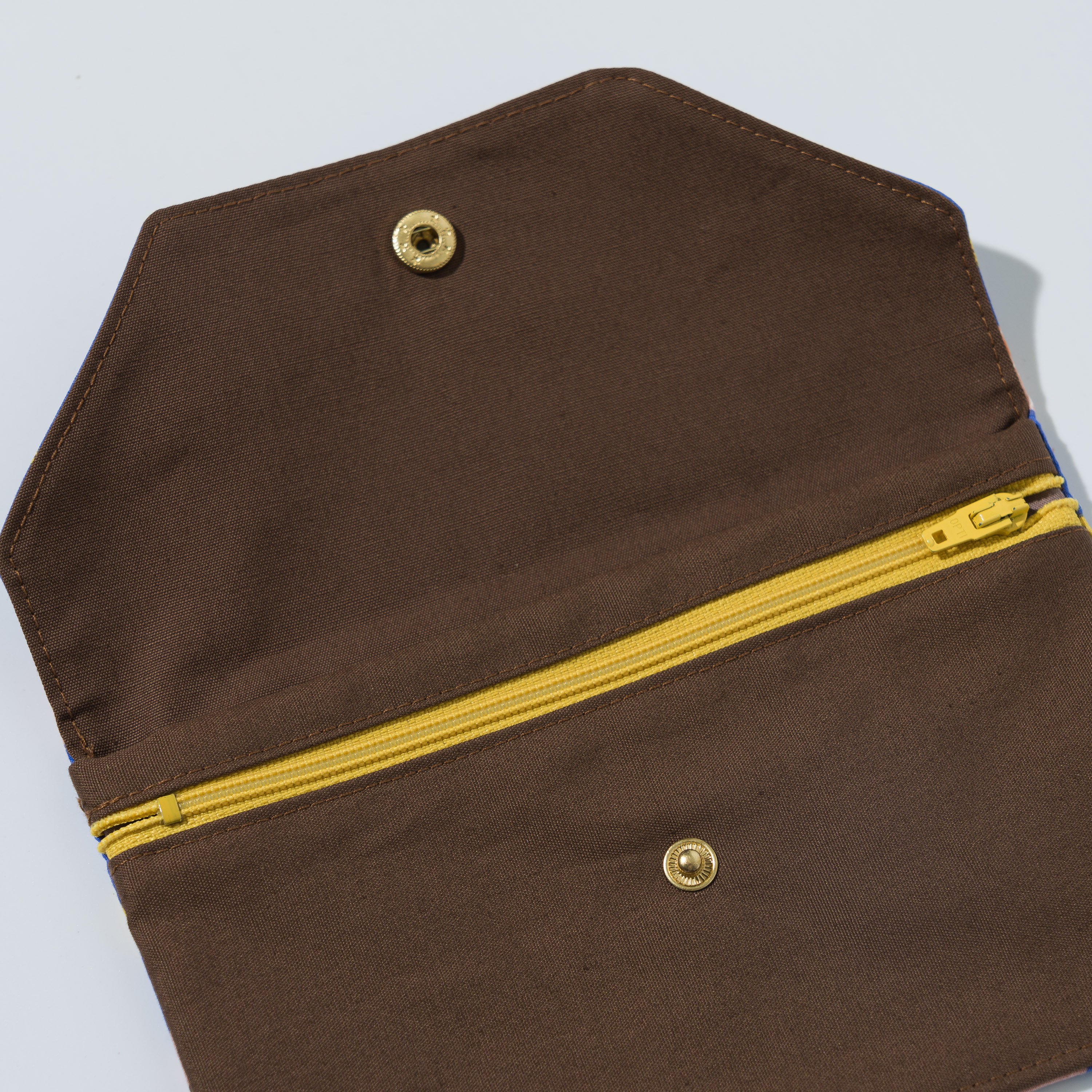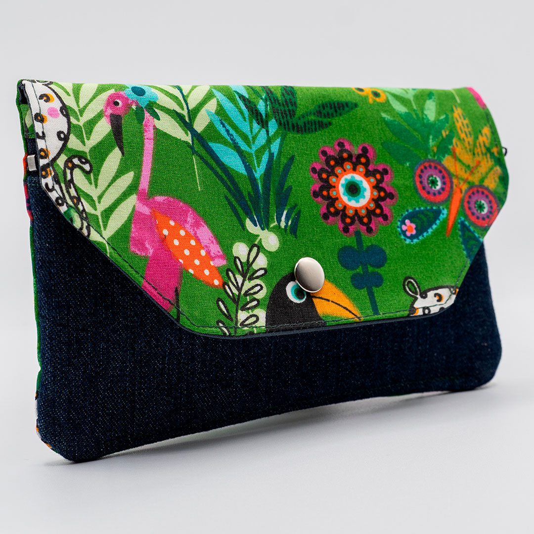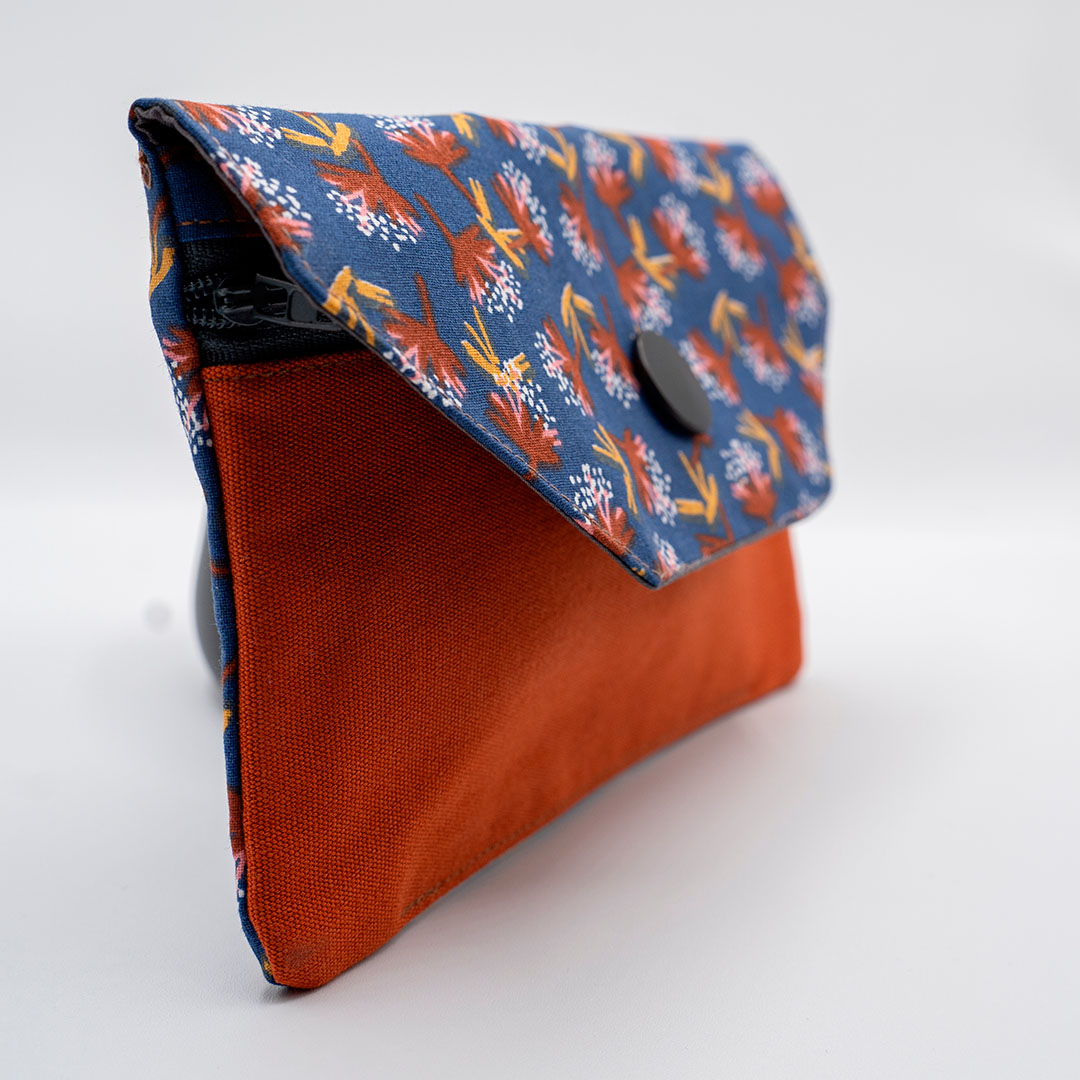 Portafoglio in tessuto taglia media, lavabile e pratico, con tasca con zip, portatessere e bottone in acciaio. Realizzato artigianalmente.