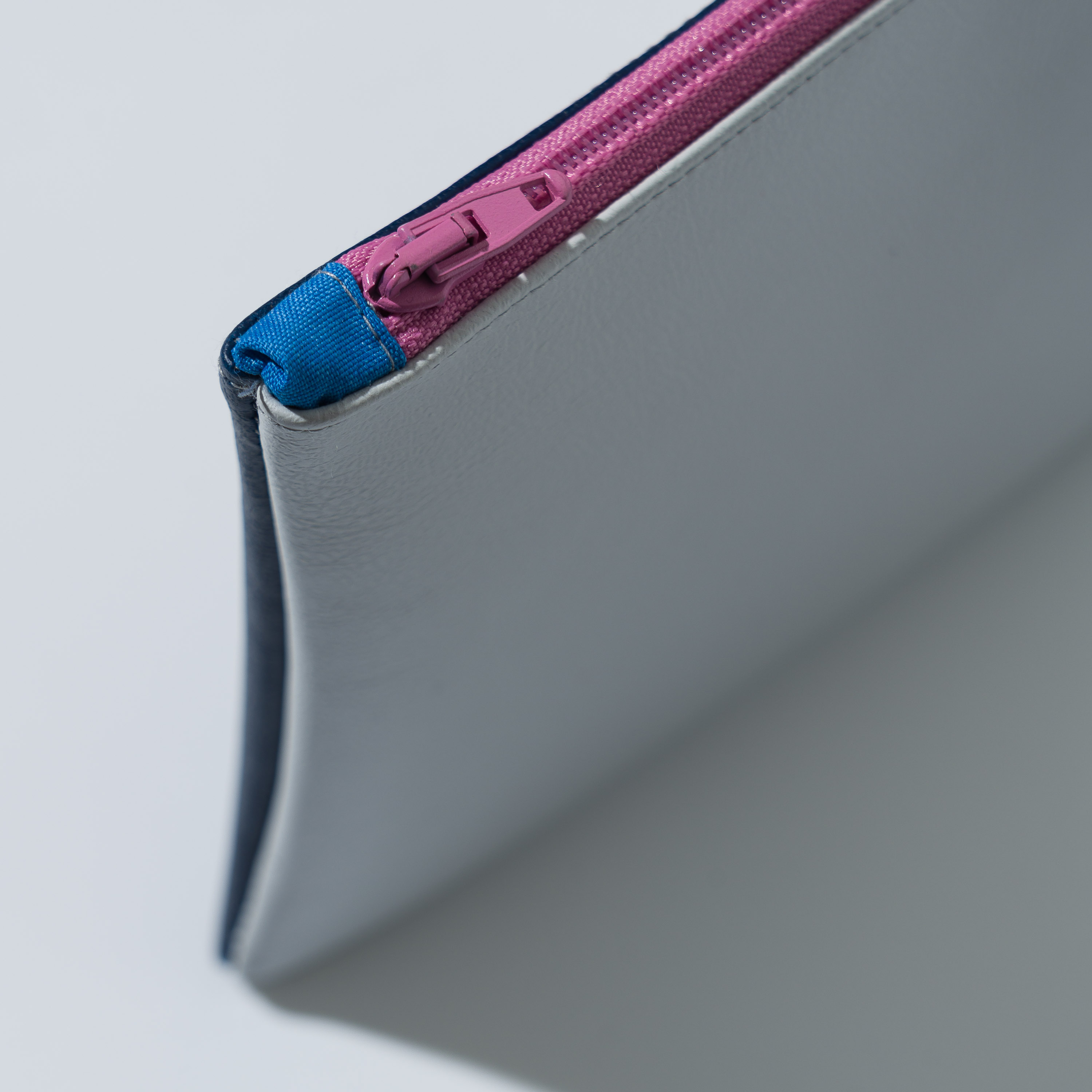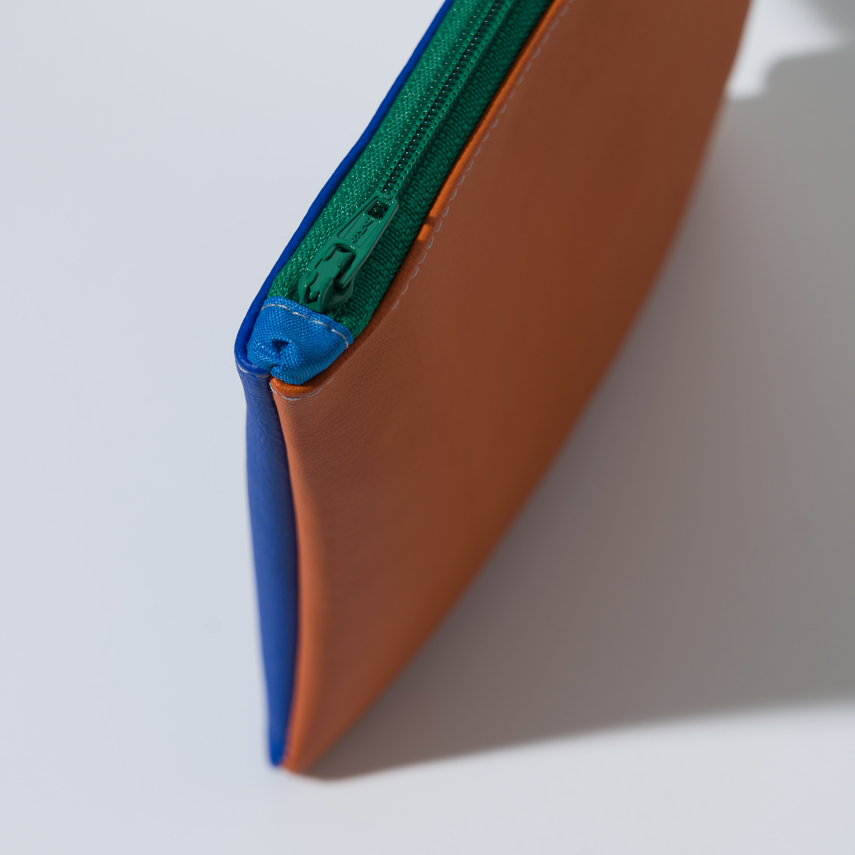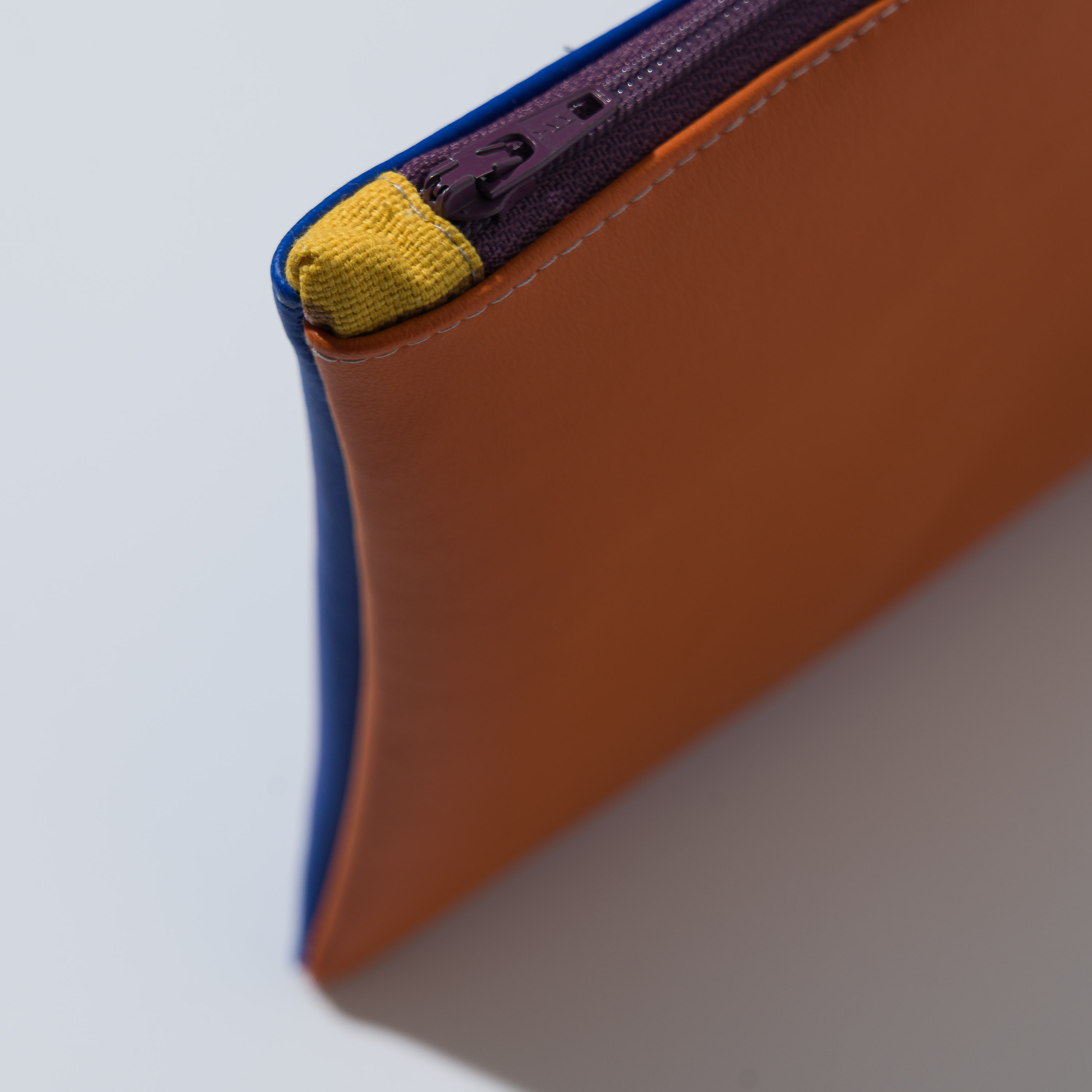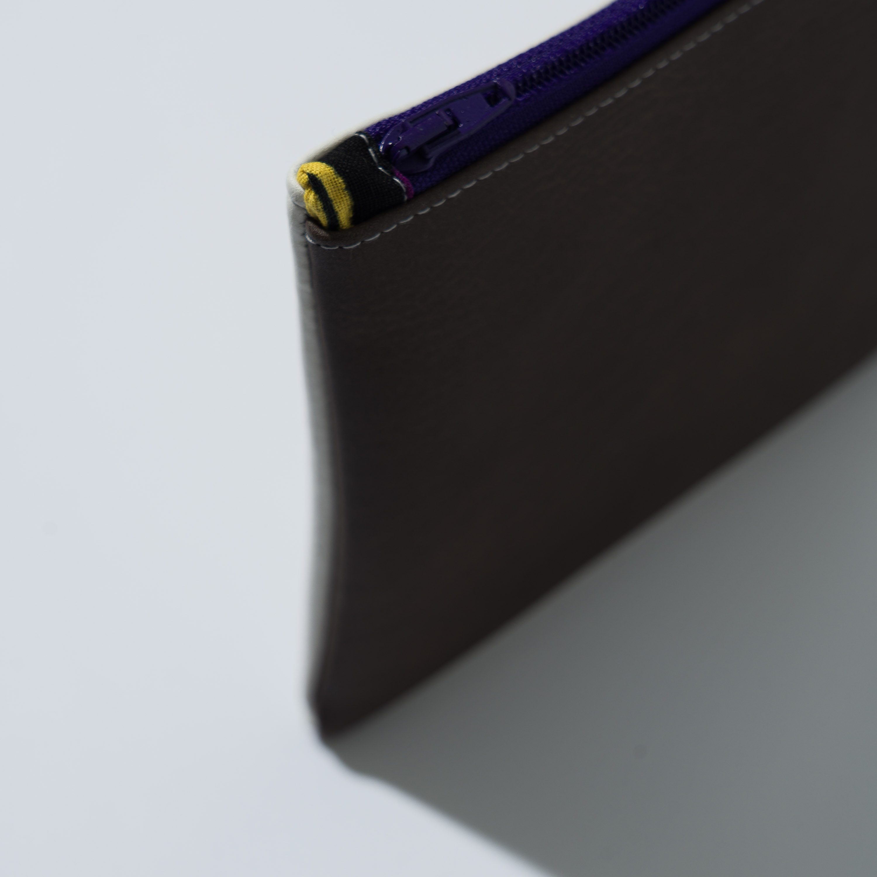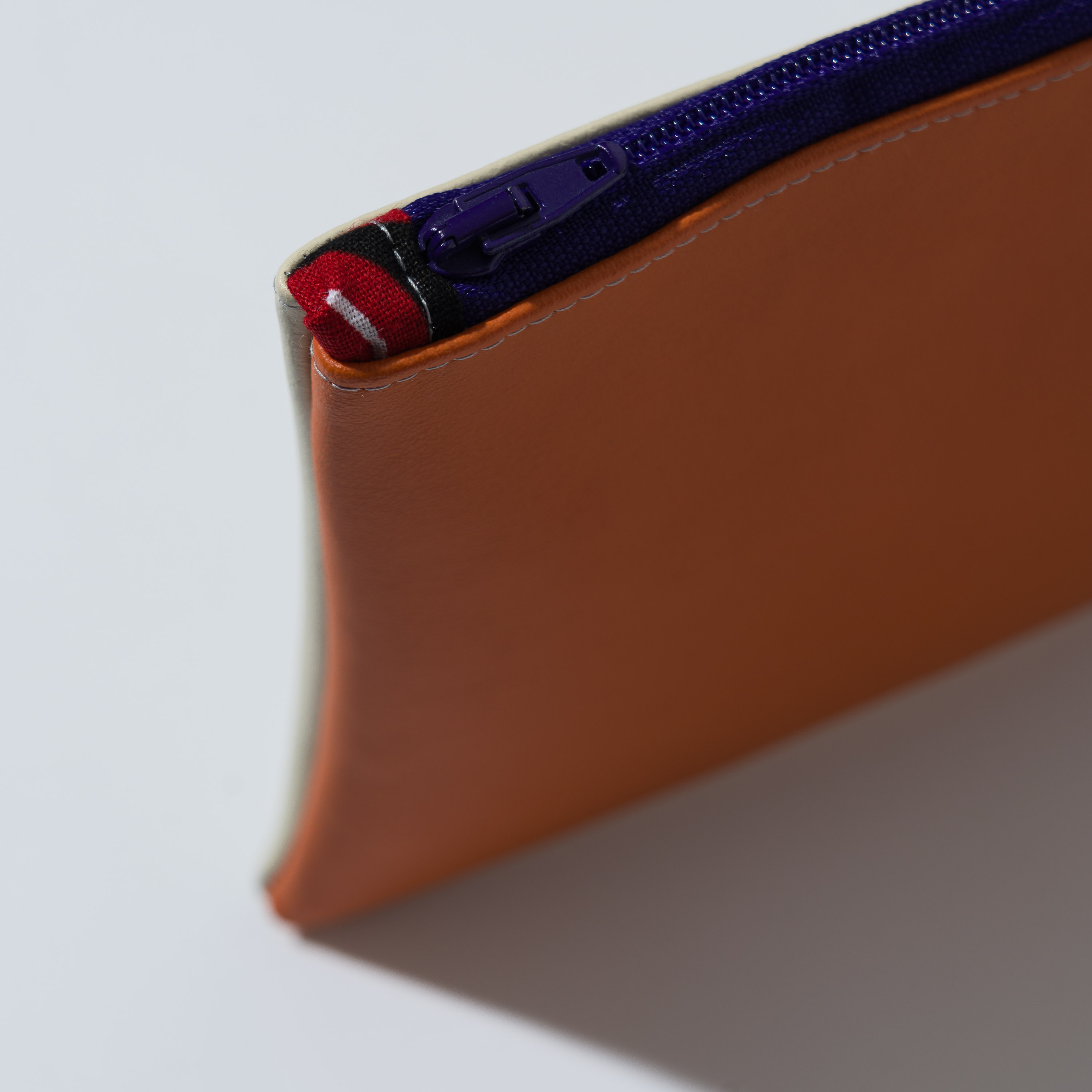 Astuccio da borsetta utile come porta oggetti, monete, medicine e/o portatelefono, con motivo bi-color in ecopelle e pratica zip. Realizzato con materiali di recupero. Non lavabile. Misure variabili indicative 16 cm x 14 cm