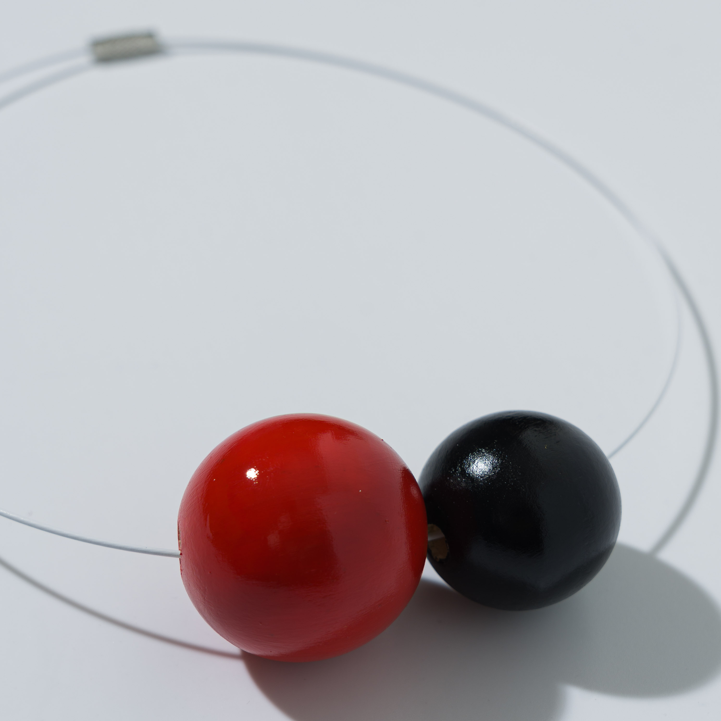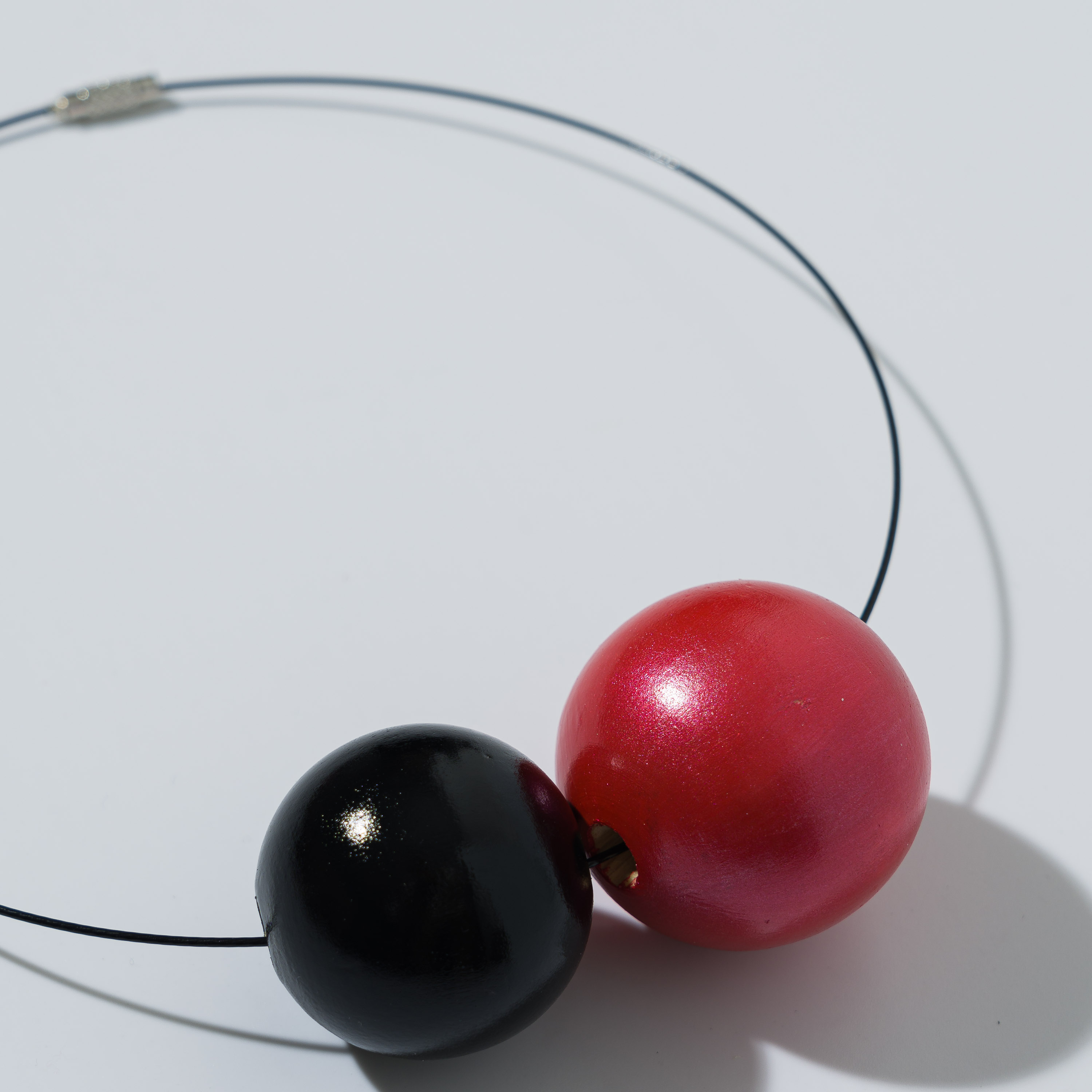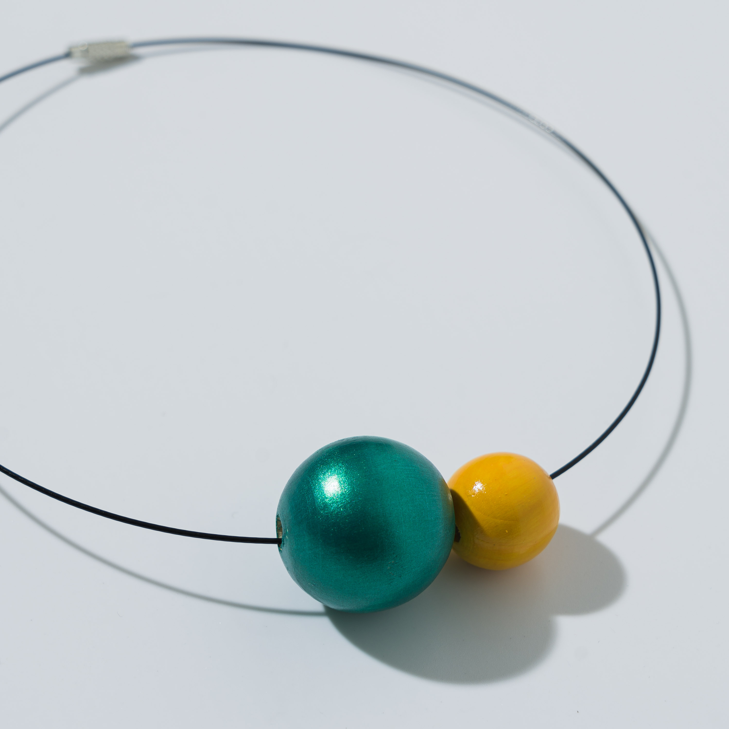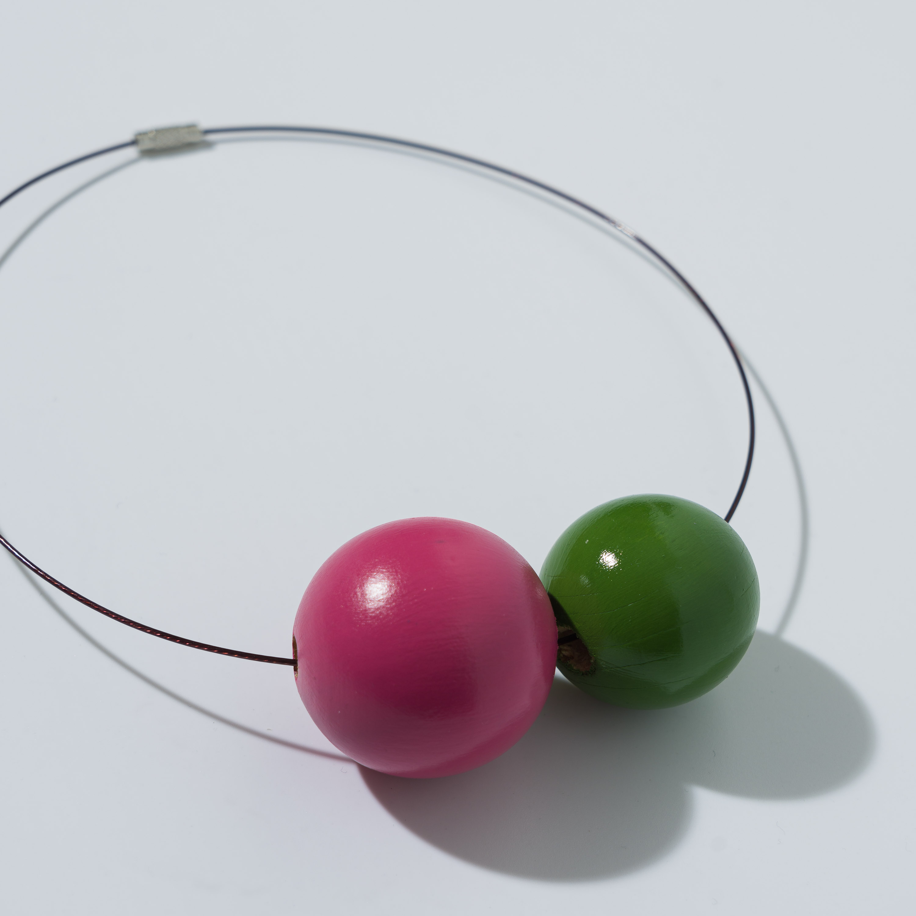Collana composta da due perle in legno dipinte a mano ed un filo di acciaio inossidabile con chiusura a vite in ottone. Realizzata in modo artigianale.