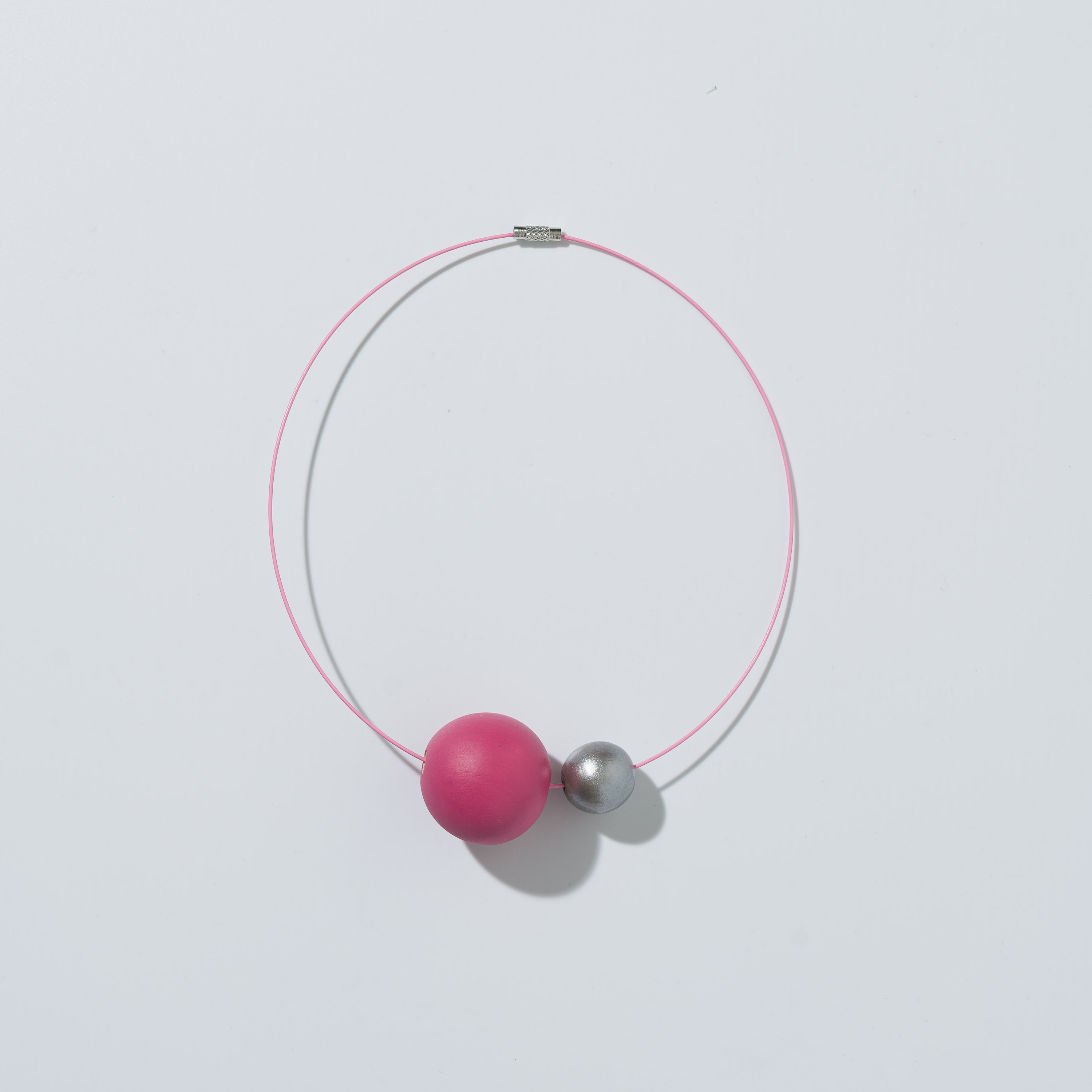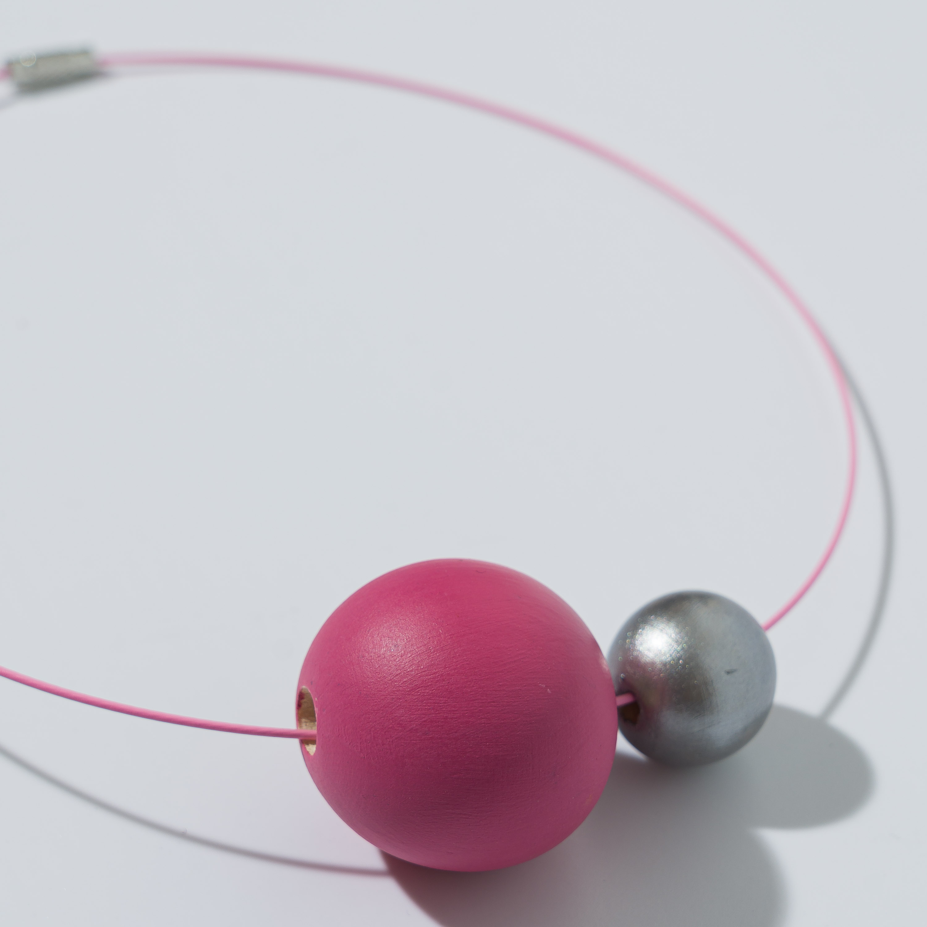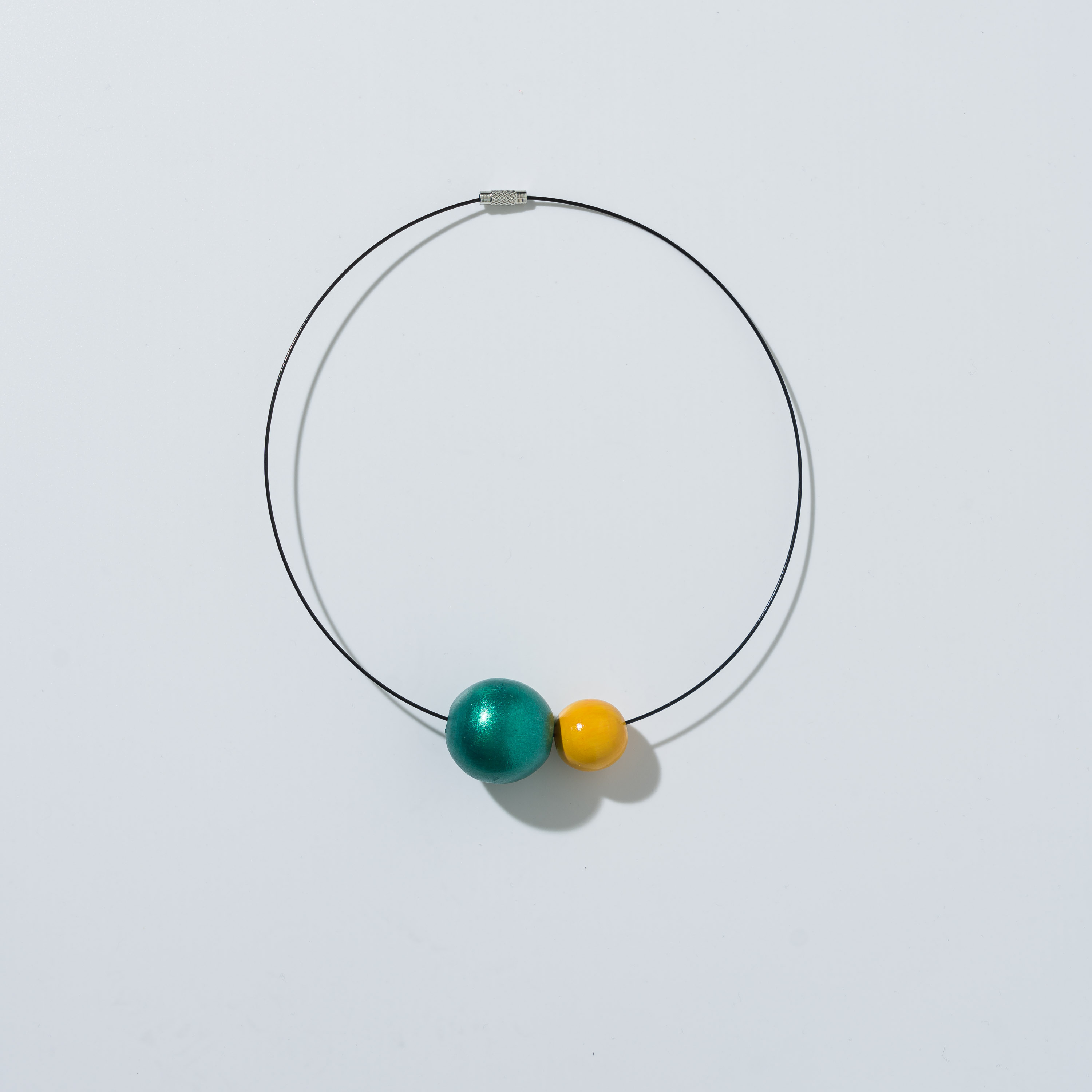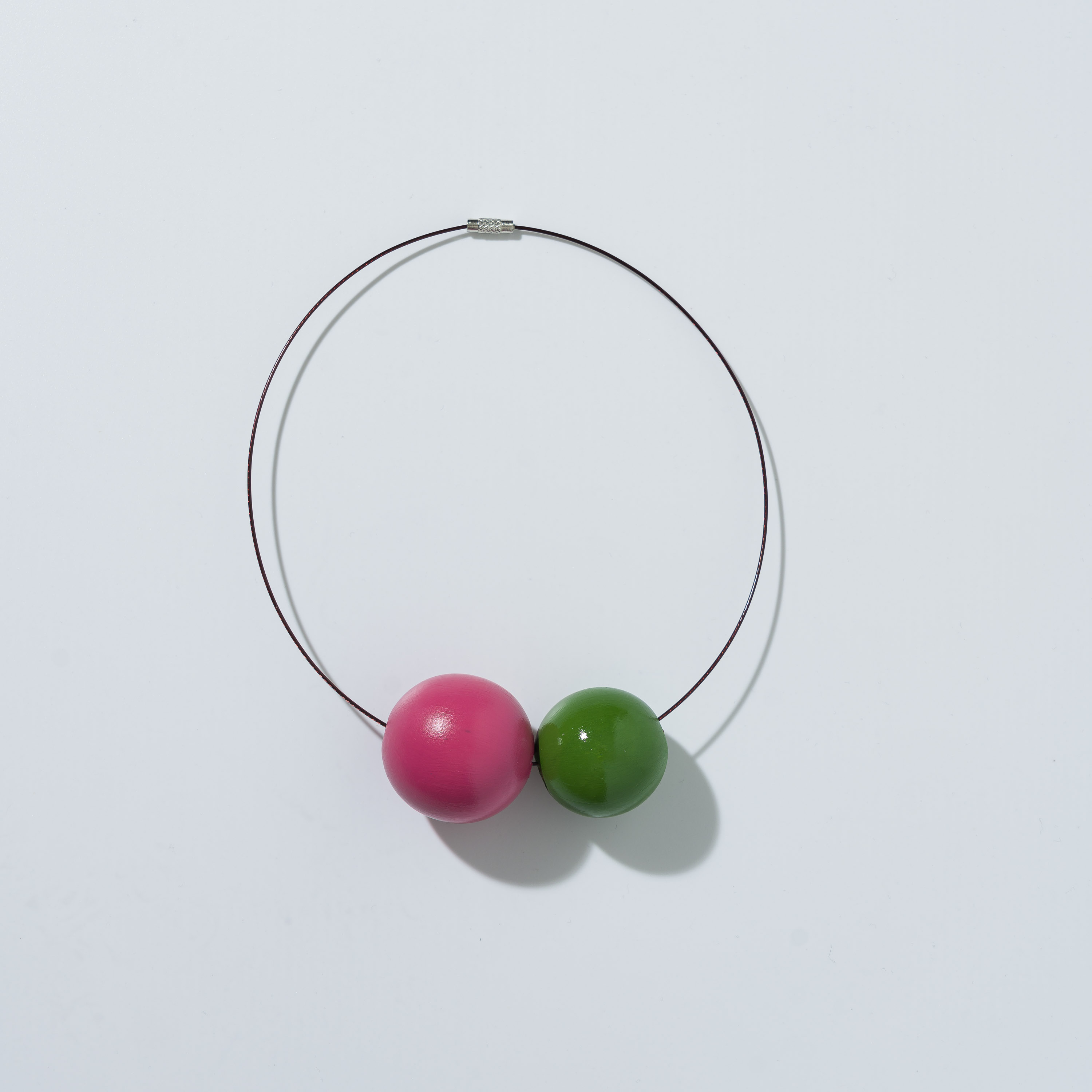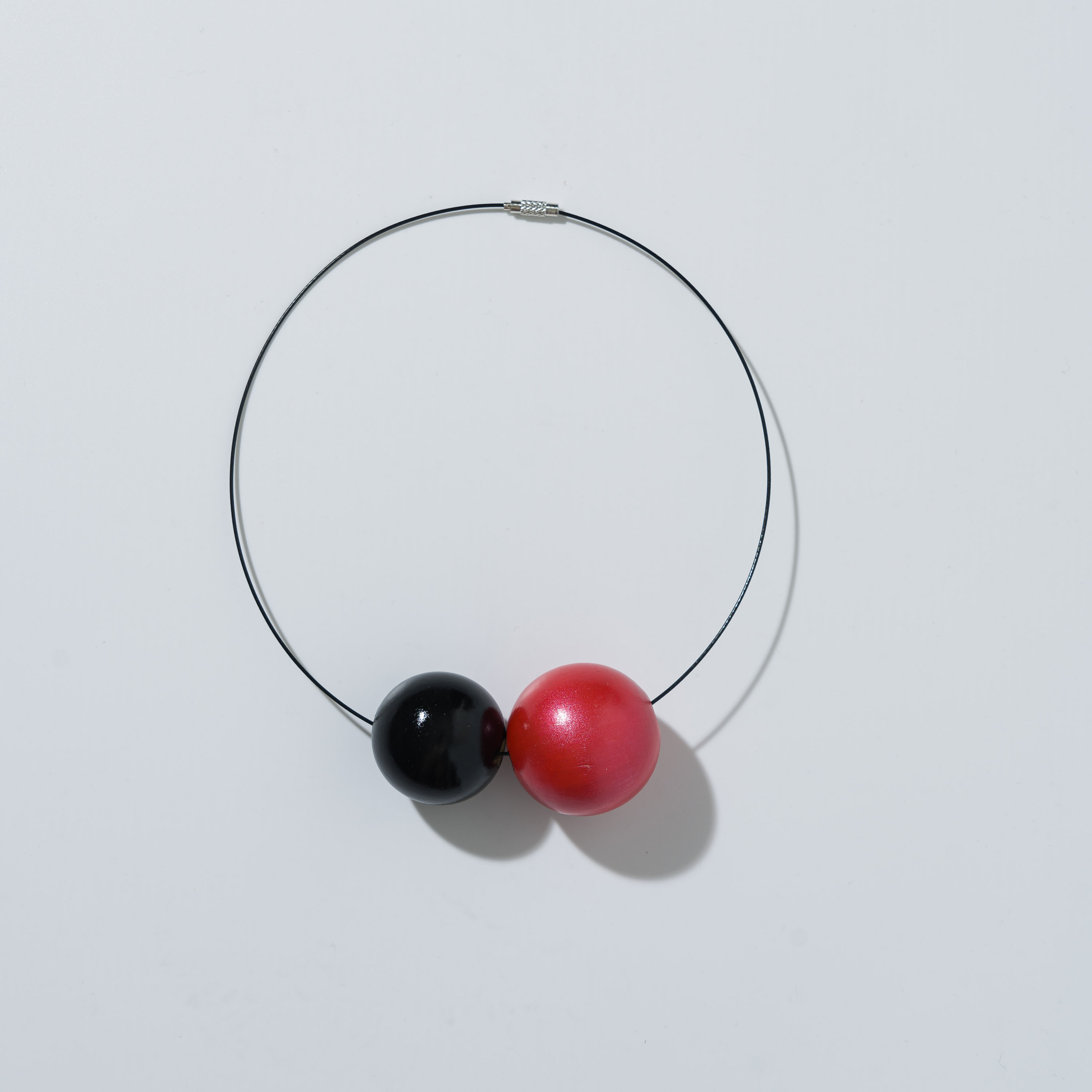 Collana composta da due perle in legno dipinte a mano ed un filo di acciaio inossidabile con chiusura a vite in ottone. Realizzata in modo artigianale.