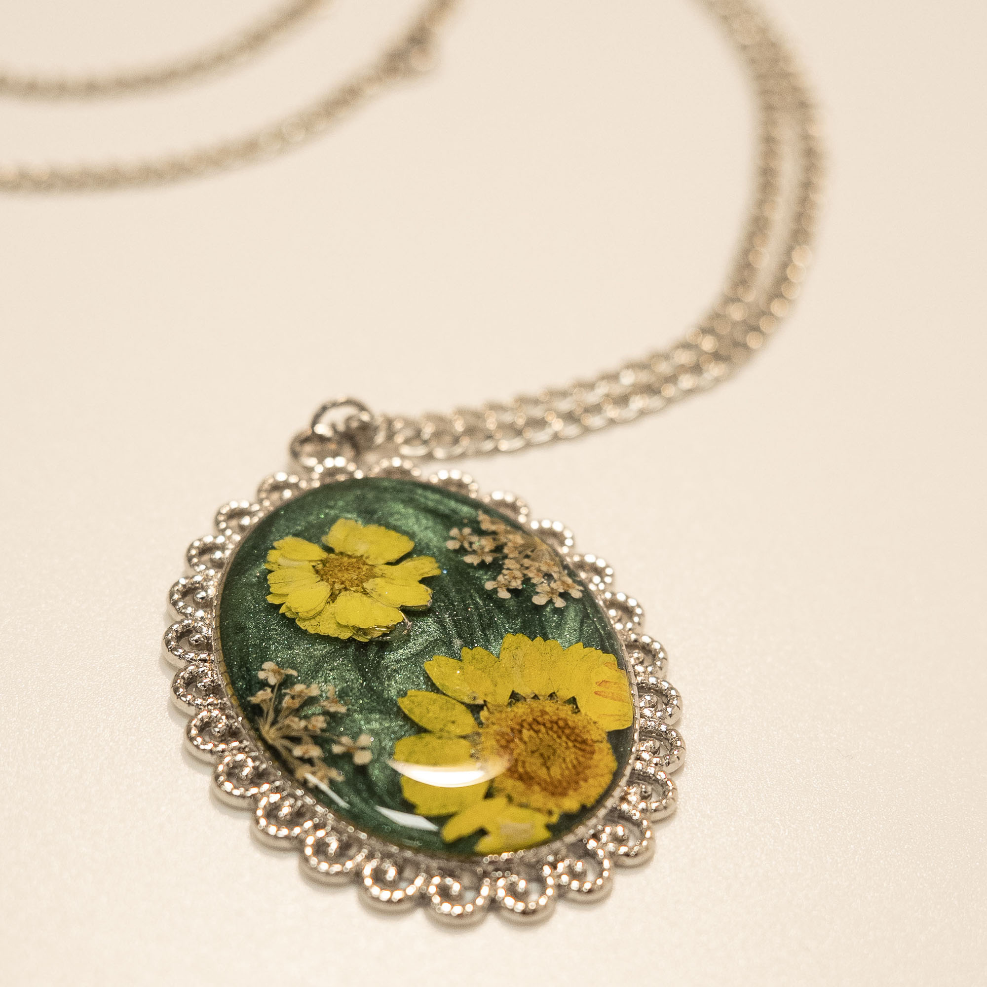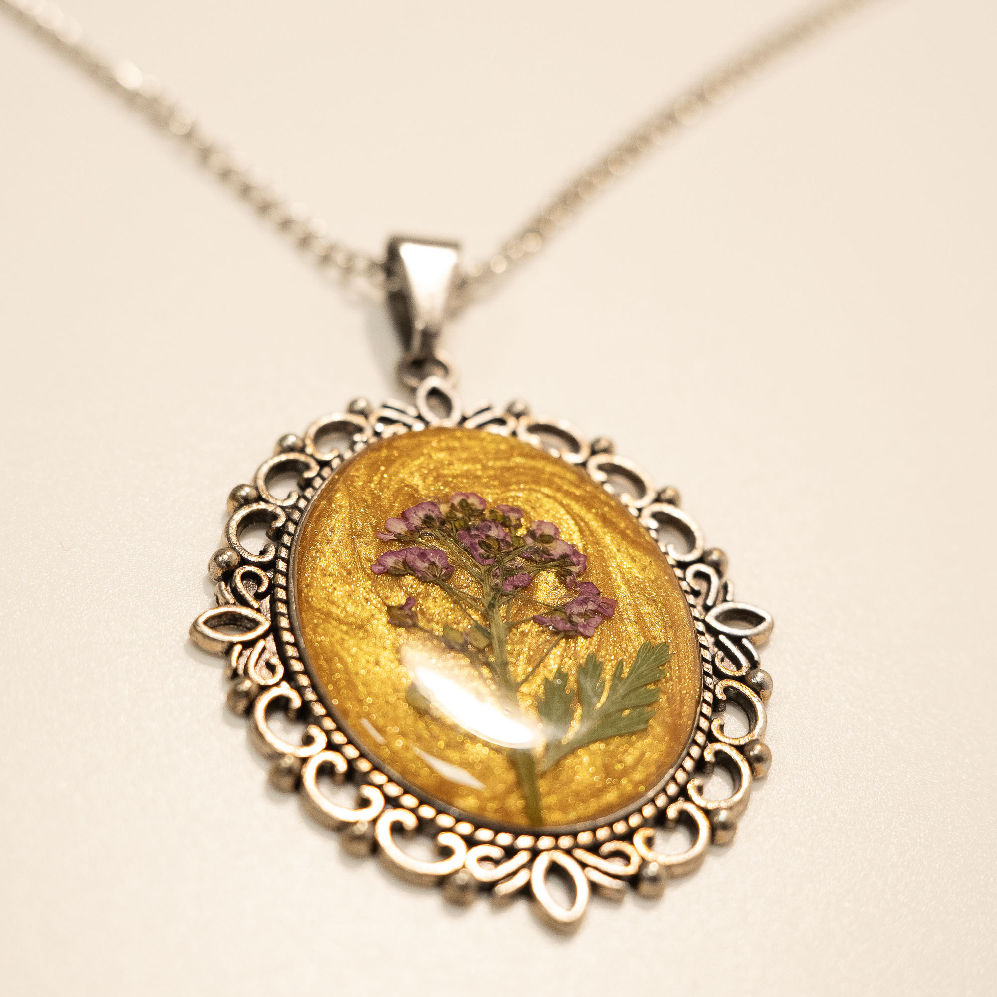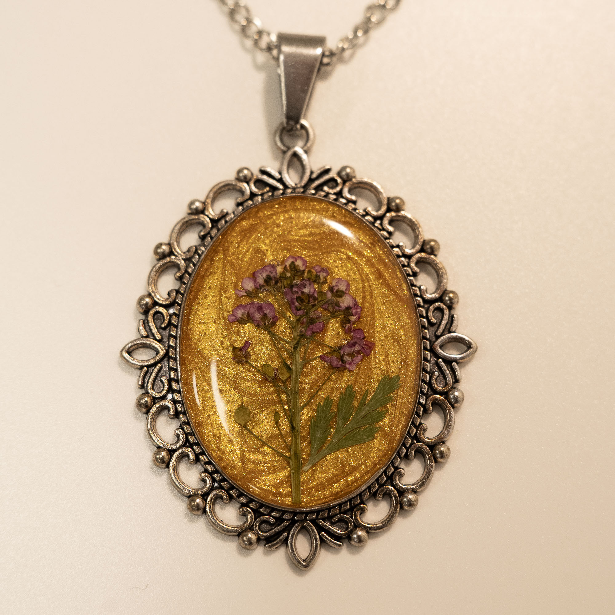 Gioiello in resina con fiori essicati e pigmenti mica, catenina in metallo e ciondoli vari, accessorio ideale per chi ama i dettagli unici e raffinati. Realizzato artigianalmente, progettato per durare nel tempo e per aggiungere un tocco di eleganza alla tua routine quotidiana.